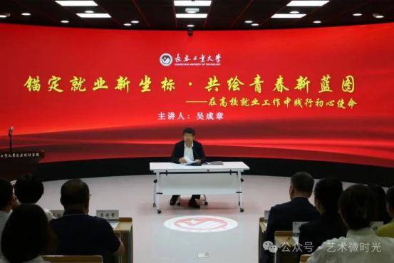 吴成章书记以《锚定就业新坐标 共绘青春新蓝图——在高校就业工作中践行初心使命》为题讲授专题党课。他强调:提高政治站位,深刻把握就业工作的政治属性,将党建引领贯穿人才培养全过程,强化使命担当,号召师生把艺术理想融入国家发展大局,以高质量就业服务彰显育人初心。创新工作机制,探索党建+就业融合模式,打造校企协同育人新生态。党课为构建新时代就业工作体系提供了根本遵循,现场师生反响热烈。