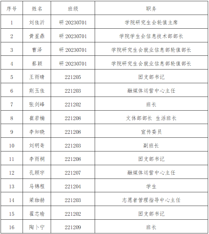 为了认真贯彻党的发展党员工作方针,充分发扬民主,增加发展党员工作的透明度,把好发展党员质量关,确保新党员质量,经本学院党委研究,现将已列入2025年度发展计划,且通过党支部民主测评的发展对象在全院范围内公示。公示时间为5个工作日(2025年9月8日至2025年9月12日)。在公示期内,党内外群众如对发展对象有意见,请以真实单位、姓名,用书面、电话等形式如实反映情况。群众反映的问题可受到法律保护,我们将严格保密。