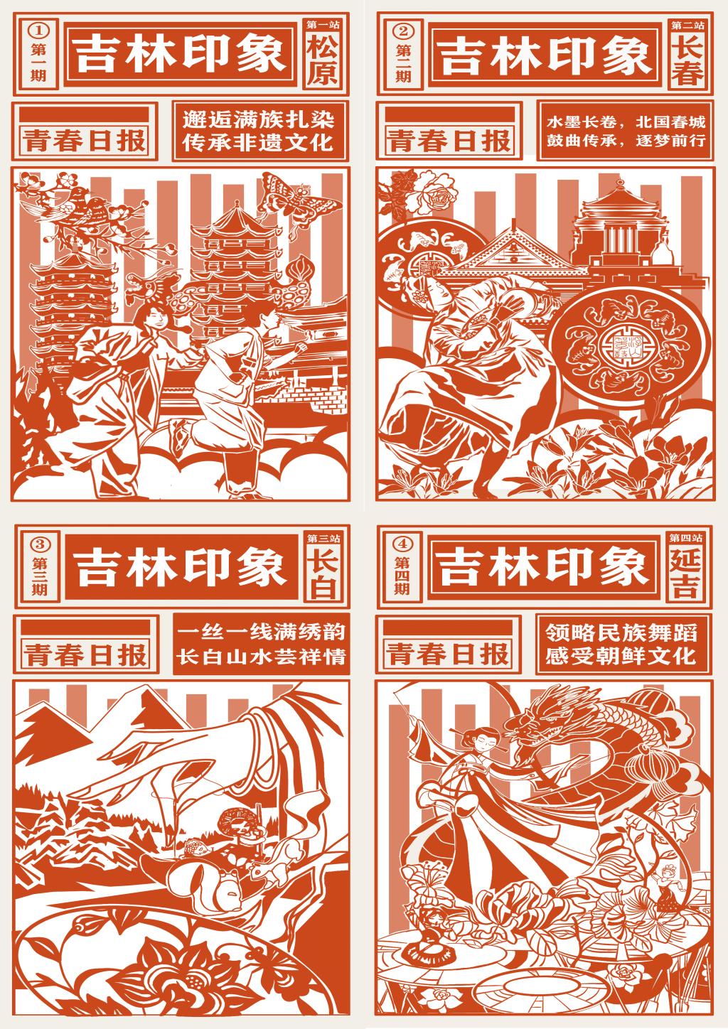 创作感想:本作品通过剪纸的形式来呈现非遗文化。画面描绘青年小记者对松原满族扎彩,长春东北大鼓,长白山满绣以及延吉朝鲜鼓等地区的非遗文化进行探索报道,领略“非遗”的独特魅力。作品呼吁大家:要学习和传承非遗文化,弘扬优秀传统文化,增强自身的民族自豪感和文化认同感。