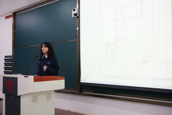 在CAD软件分享环节,主讲学生黄钰雯通过展示实际项目图纸,详细演示二维绘图的精准绘制步骤、三维建模的复杂流程以及严谨规范的图纸标注方法,将复杂的技术要点以通俗易懂的方式呈现给同学们。