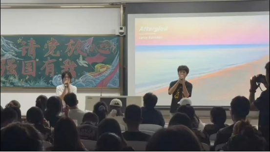 随着 11 号选手的演讲落下最后一个音节,王一诺学姐与金圣皓学长登台,演唱歌曲《虹之间》,进一步展现学院学子的综合素养,缓解赛场紧张氛围,将赛场氛围烘托至高潮。